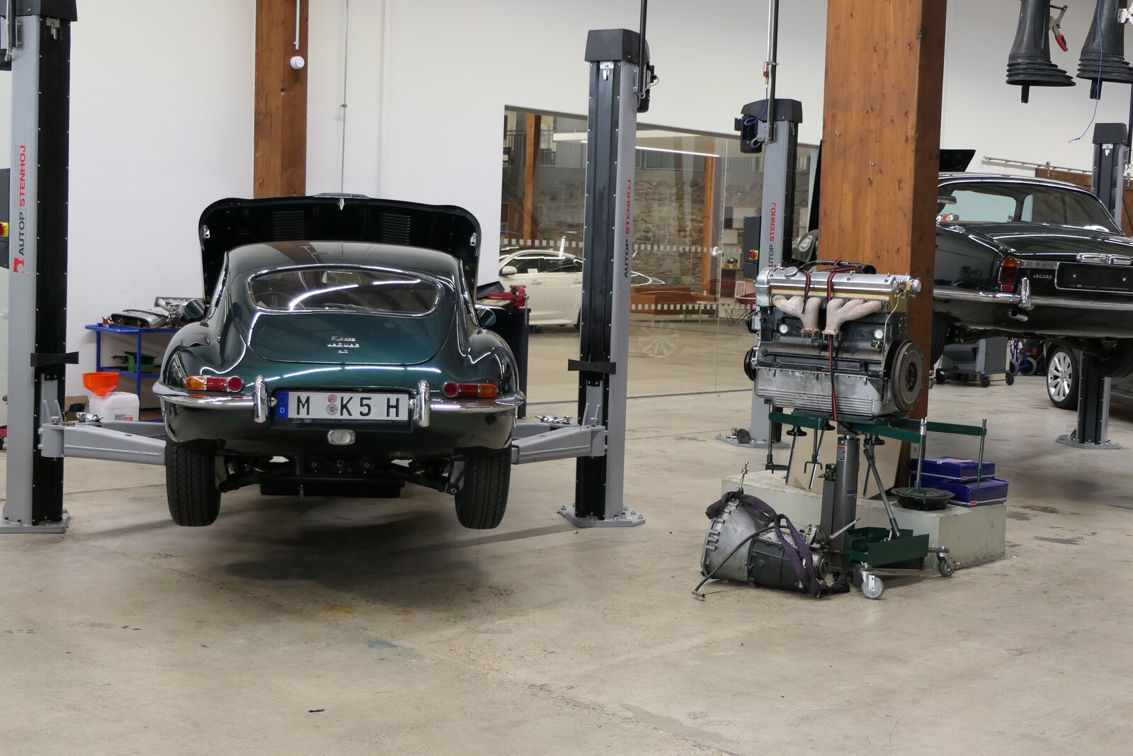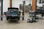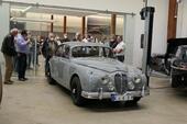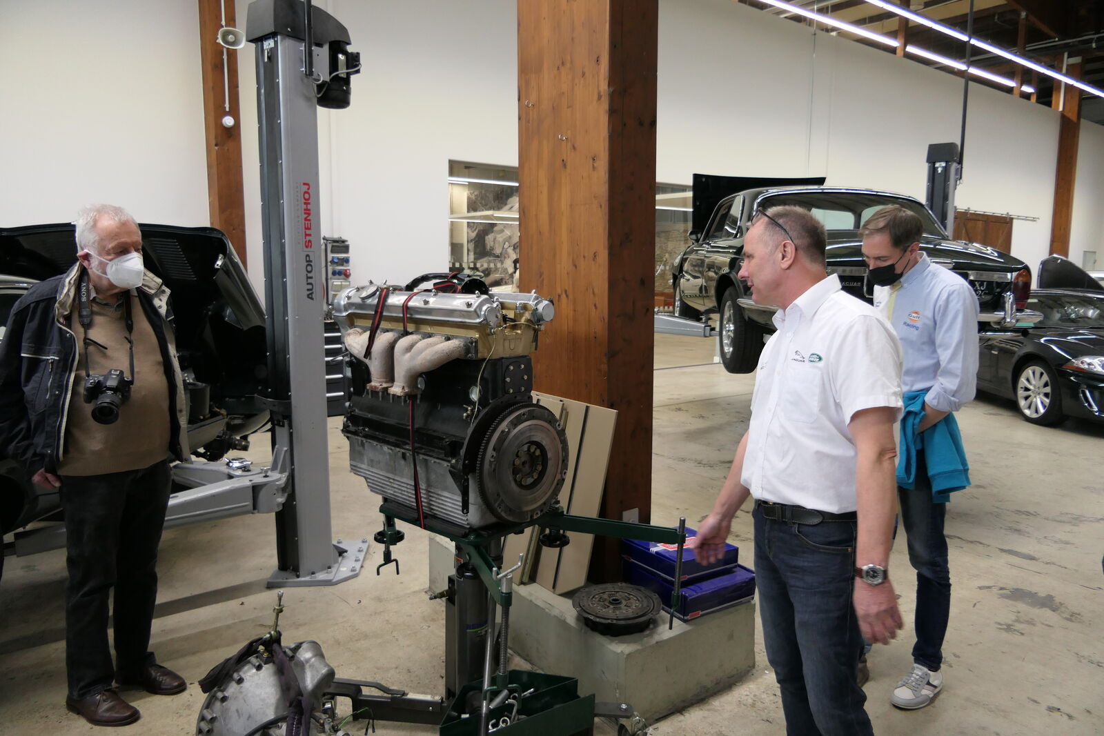 Danach führte Marco Walter durch die Werkstatt und erläuterte anhand von aktuellen Kundenfahrzeugen die durchzuführenden Arbeiten. Auch hier reichte die Palette vom klassischen MK IX bis hin zum „modernen“ XK8, vom einfachen Service bis zur kompletten Restaurierung. Wundervolle Fahrzeuge wie ein perfekt optimierter MK II, der ausgebaute Sechszylinder-Motor eines E-Type oder auch ein originaler Mark VII boten reichlich Gesprächsstoff. Umfassend konnte Marco Walter den Wissensdurst der interessierten Gruppe stillen. Auch die Ersatzteilversorgung sei bei Jaguar grundsätzlich gut. Verständlicherweise musste auch er bei Spezialteilen für den Vorkriegsklassiker SS 100 passen, der einem Mitglied zugelaufen ist.