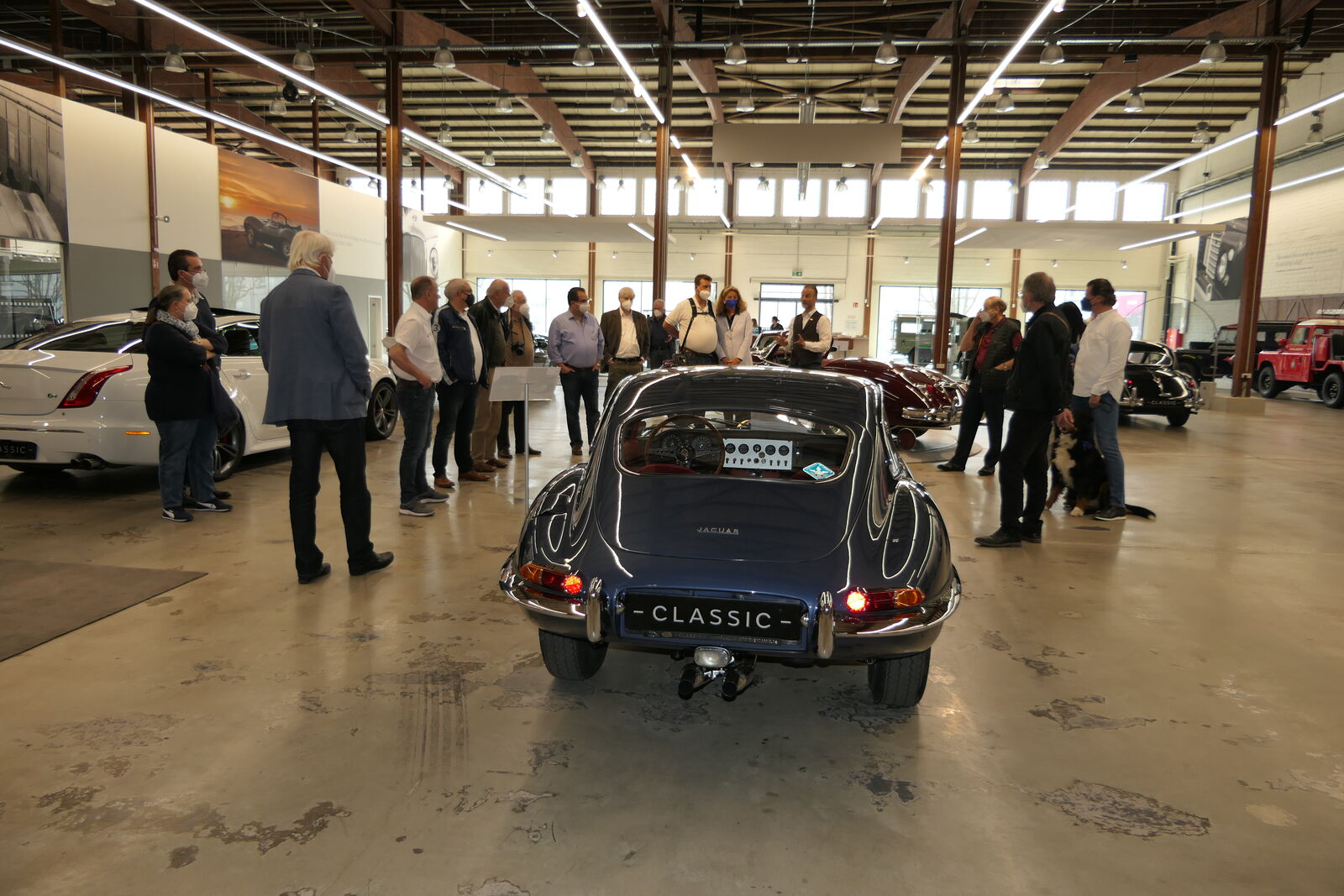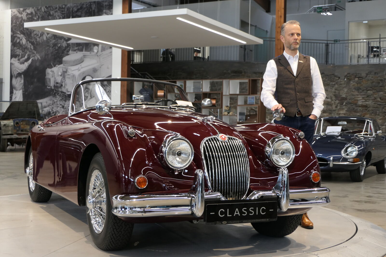 Oliver Schepp-Danne erläuterte die Standortwahl Essen mit der Bedeutung für den deutschen, aber auch europäischen Markt. Die Region hat die höchste H-Kennzeichen-Dichte in Deutschland, liegt nahe an den Benelux-Staaten und ist verkehrstechnisch europaweit gut angebunden. Danach kamen wir in den Genuss, die Showcars des Angebotes zu bewundern. Vom XK 120 über den E-Type bis zum Jaguar XJ der Baureihe X351 reicht die Auswahl an sorgfältig aufgearbeiteten Klassiker mit wenig Kilometern auf dem Zähler. Liebevolle Details wie das Kofferset im XK 150 ließen das Herz des Enthusiasten höherschlagen.