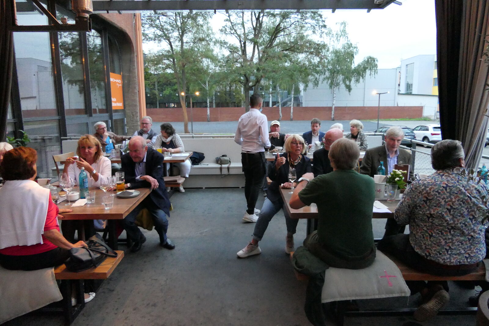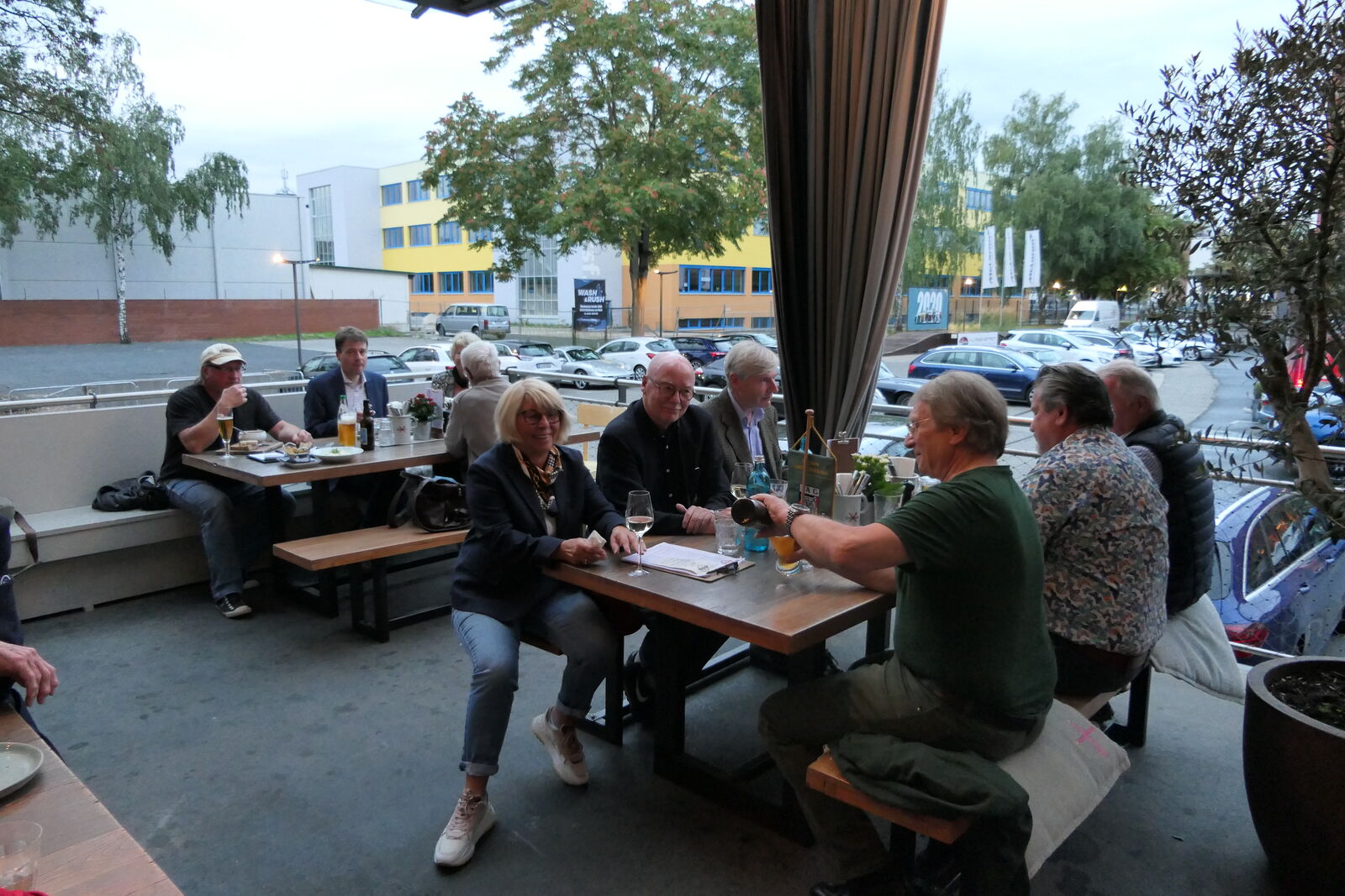 Auf der Terrasse der „Werkskantine“ herrschte schon ein munteres Treiben. Diesmal waren wieder Gäste dabei, die (noch) keine Mitglieder sind, aber den Erfahrungsaustausch mit anderen Jaguarfreunden suchen. Das gute Essen und Trinken sowie das angenehme Ambiente trugen zur guten Stimmung bei. Die Corona-Vorschriften blieben aber auch dort in Form von Adressenlisten und Maskenpflicht auf den Gängen des Lokals gegenwärtig. Der Regen hatte aufgehört und in der hereinbrechenden Dunkelheit wurden die interessanten Fahrzeuge auf dem Parkplatz inspiziert. So bot dieser Abend allen Beteiligten etwas.