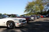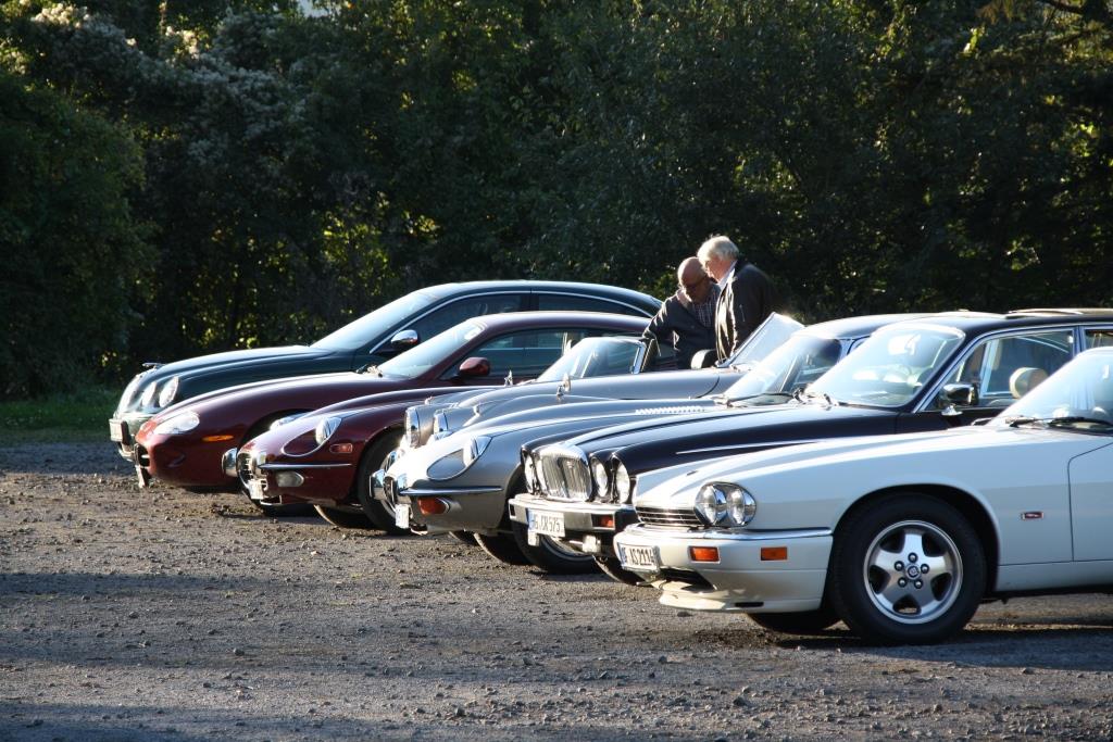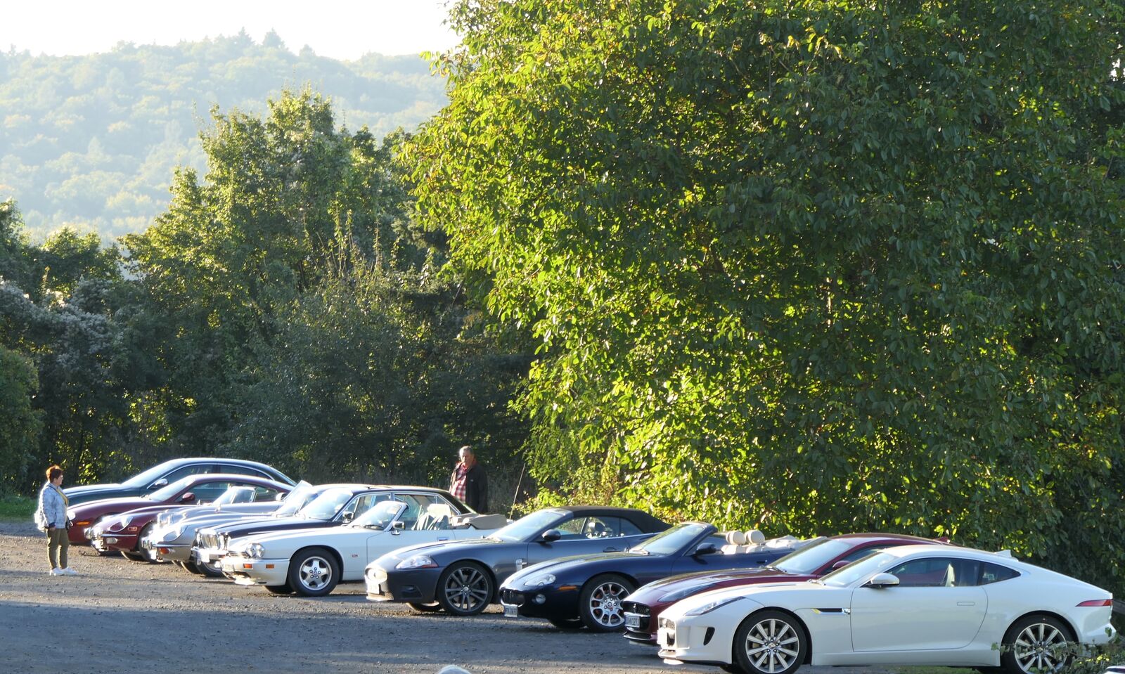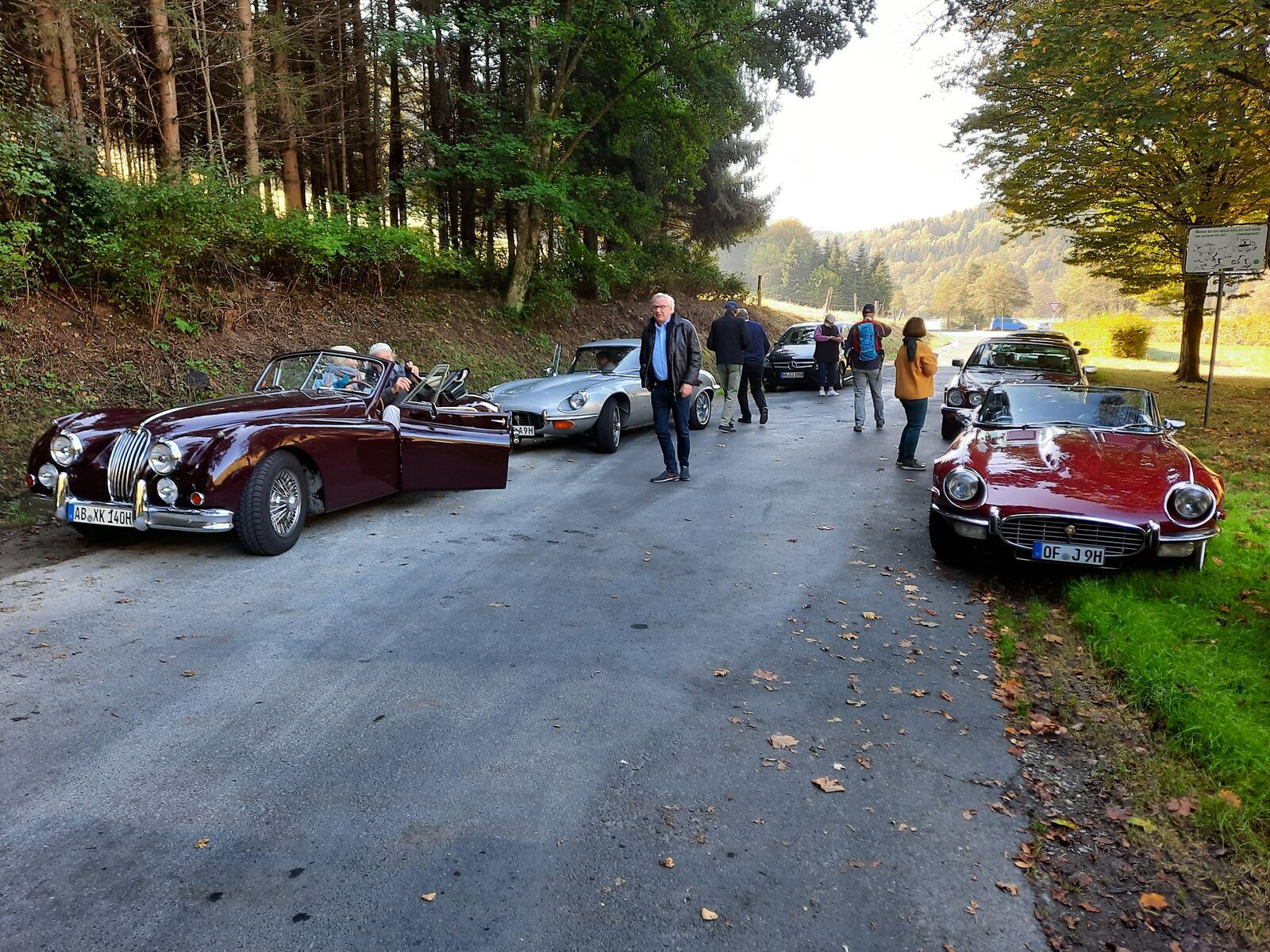 Geplant war eine Saisonabschlussfahrt – quasi wie jedes Jahr – für Anfang Oktober. Diesmal sollte es also am 09.10.2021 losgehen. Und wie begann es? Mit einer Wettervorhersage, die nicht besser hätte sein können – nach Auflösung von vereinzelten Frühnebelfeldern waren 11 h Sonnenschein angekündigt. Und so kam es auch. Am vereinbarten Treffpunkt erschienen 18 Jaguare aus 7 Jahrzehnten und wer die Wahl hatte zwischen geschlossener Limousine und Cabrio, wählte nochmal letzteres. Man konnte die gesamte Tour offen fahren, es war herrlich!