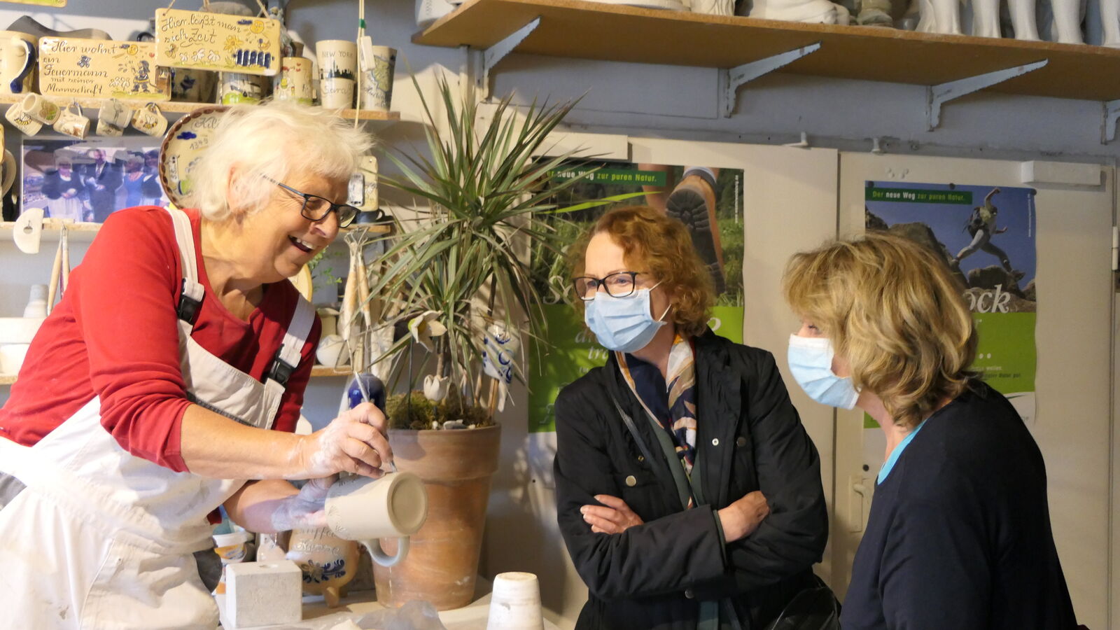 Also Internet angemacht und auf „Landkartenprogramm“ eine mögliche Route zusammengestellt – dann eine schön gelegene Lokalität für die Mittagsrast ausgesucht. Angerufen; für ca. 20 – 30 Personen – o.k., geht klar. Weiter geplant: es soll ja noch ein Zwischenziel für den Nachmittag geben – Westerwald? Da fällt einem „Kannenbäckerland“ ein. Also gibt es eine Töpferei, die als Zwischenziel geeignet ist – mit Vorführung vielleicht? Ja, gibt es – angerufen; geht! Wir können mit ca. 20 – 30 Personen kommen; es gibt eine Vorführung und Kaffee und Kuchen. Wurde im Internet von ehemaligen Teilnehmer*innen sehr gelobt.