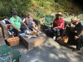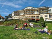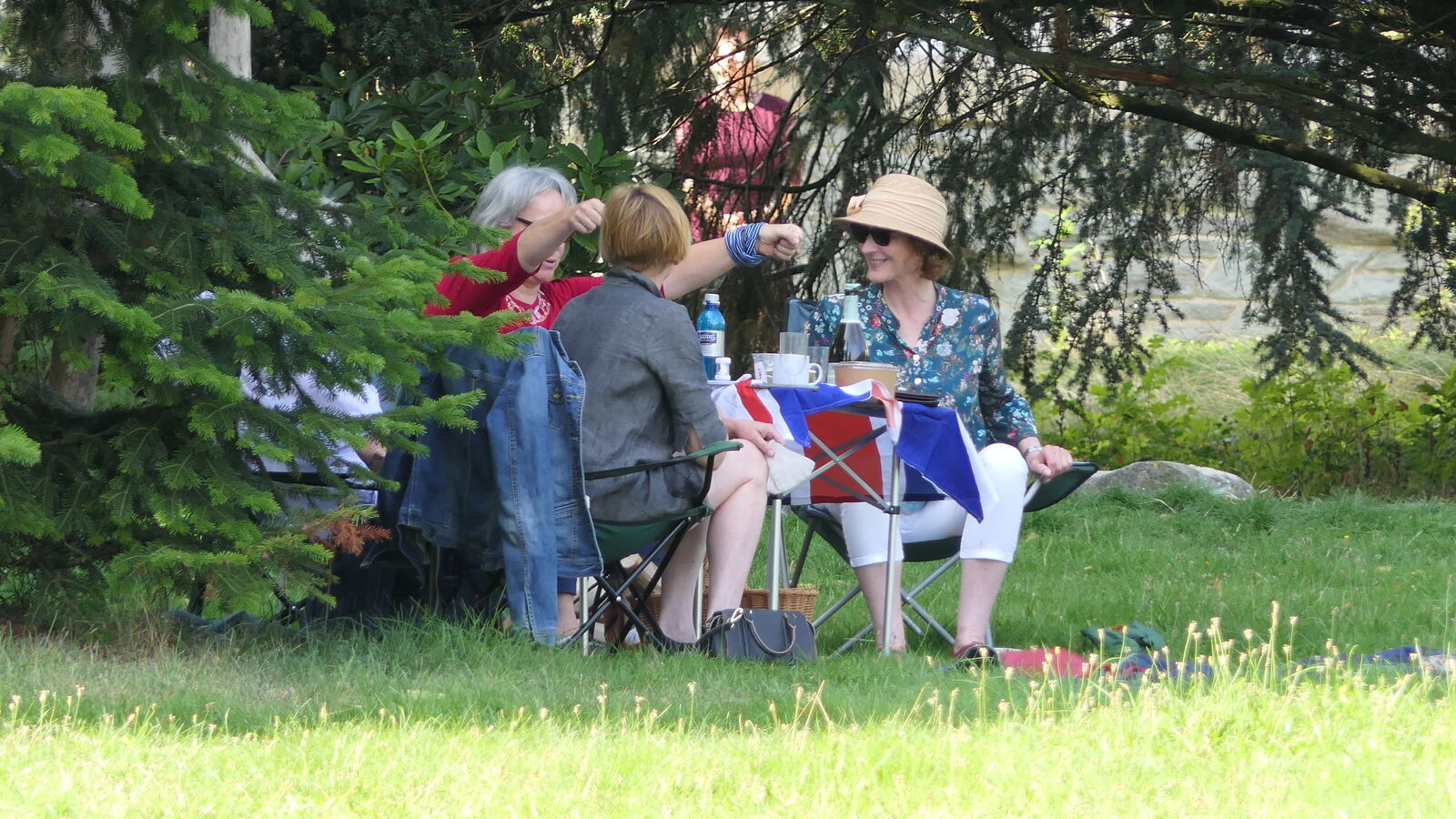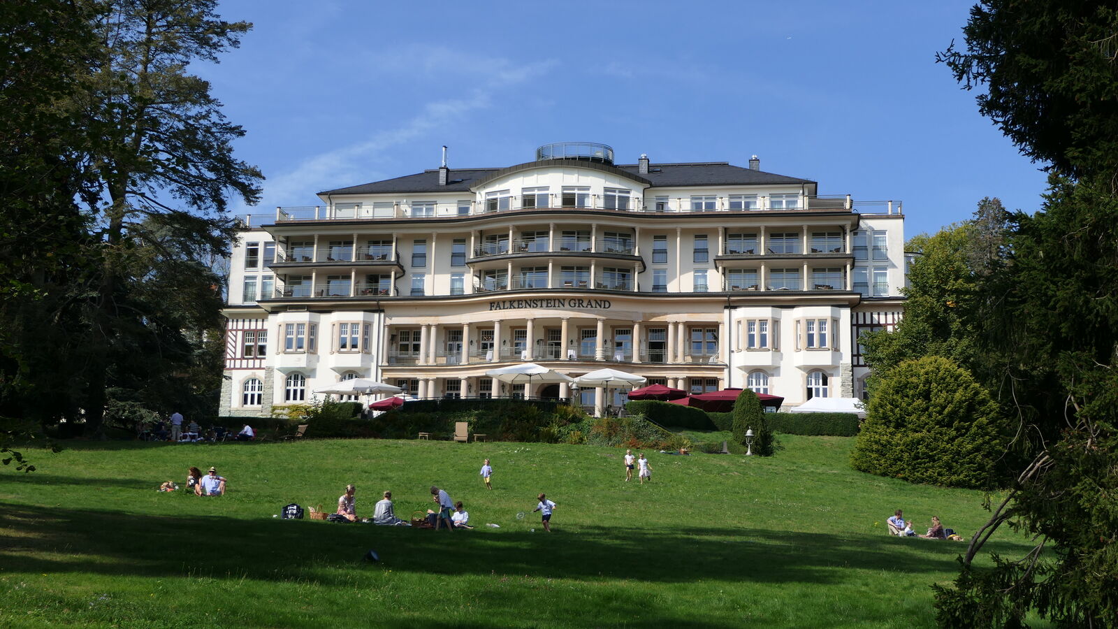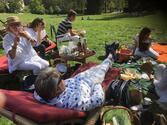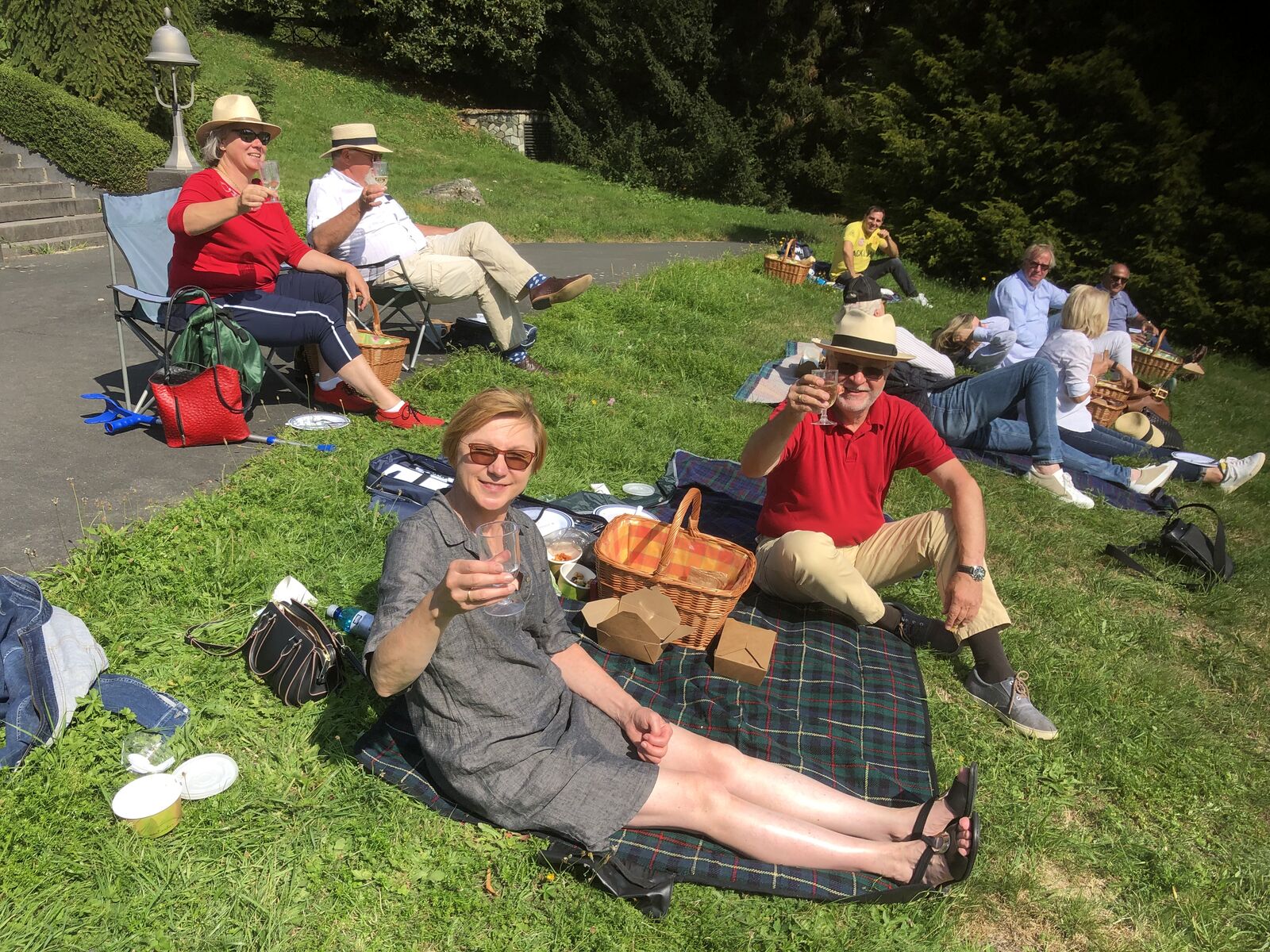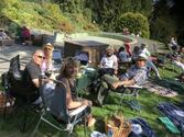 Im Schlosshotel Falkenstein war der Parkplatz reserviert, als die Kolonne eintraf. Picknickrucksäcke und eine Tüte mit leckerem Essen standen für die Teilnehmer(innen) bereit. Auf den ausgeteilten Picknick-Decken, dem hoteleigenem Gestühl oder mitgebrachten Camping-Möbeln nahm dann jeder Platz, um den wundervollen Blick auf die Mainebene mit der Silhouette der Stadt Frankfurt zu genießen. Die Sonne gab sich alle Mühe, die nötige Wärme zu spenden. Und als die leckeren Burger für uns frisch gegrillt waren, gab es noch ein kulinarisches Highlight.