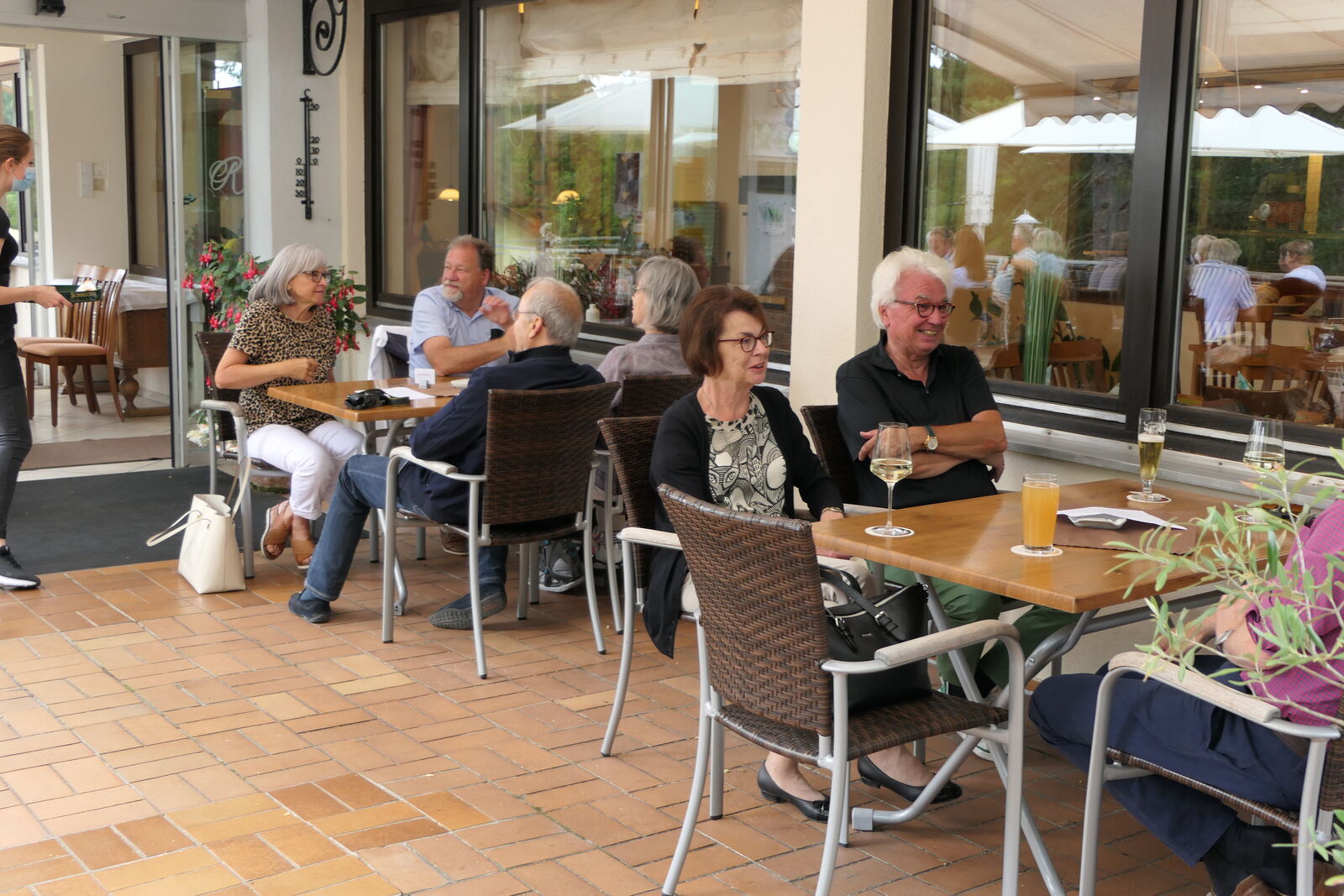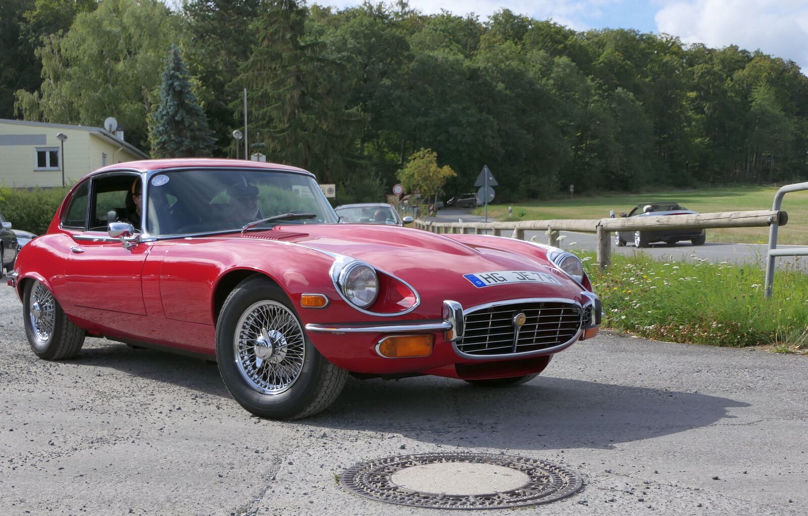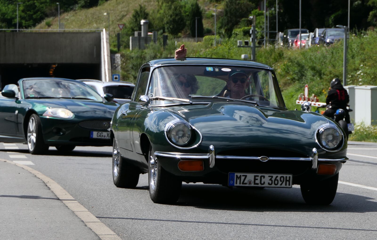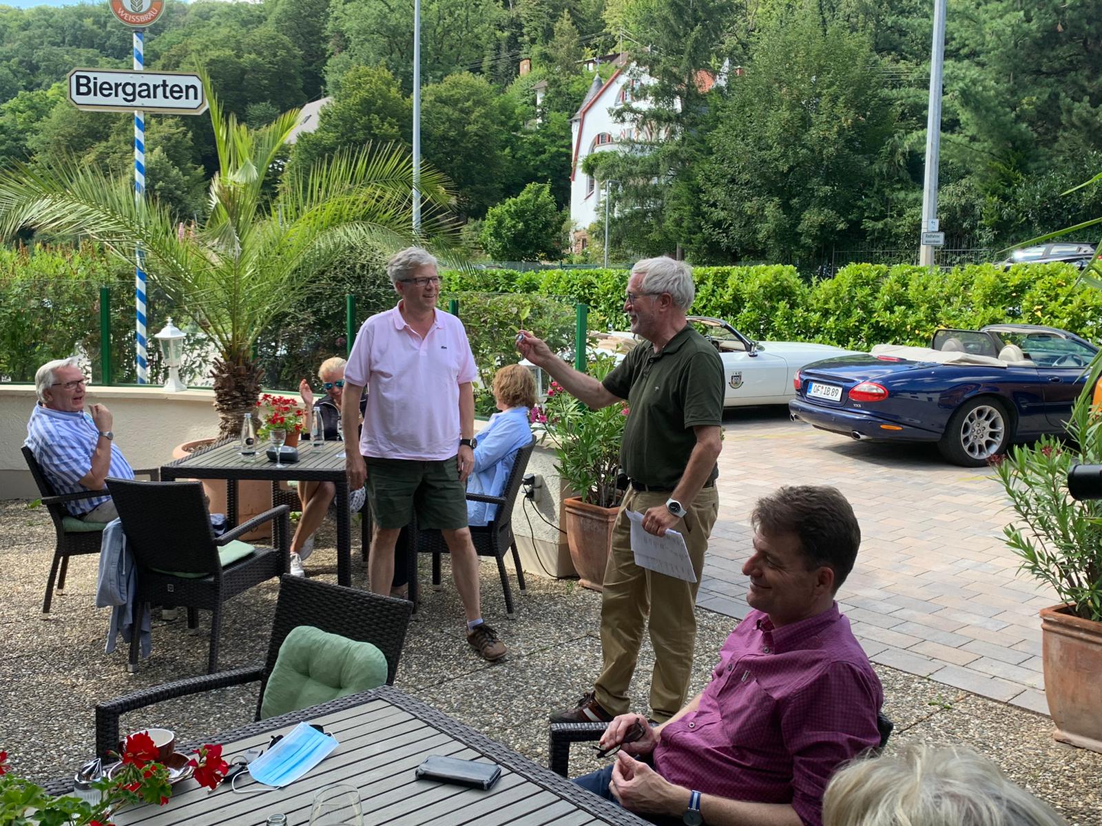 Das letzte Stück der Tour erstreckte sich bis ins Neckartal und dann über Odenwaldhöhen bis ins Rheintal nach Schriesheim. Trotz guter Beschreibung im Roadbook verlängerten einige Teilnehmer die Ausfahrt, indem sie die etwas unübersichtliche Einfahrt zum Hotel „Scheid“ verpassten und durch einen Tunnel erstmal in den Ort fuhren. Aber schließlich waren alle wieder auf der Terrasse des Restaurants versammelt und Sektionsleiter Rüdiger Bonneß konnte sich bei den Dolleschels mit einem kleinen Präsent (ein Nagelknipser mit Jaguar-Logo!!!) bedanken. Und damit die Jaguar-Gemeinde sich untereinander besser kennt, stellten sich alle teilnehmenden Teams kurz vor. Bei Kaffee und Kuchen klang so eine wunderschöne Ausfahrt aus, die zeigt: Auch von Corona lassen sich die Jaguarfreunde dieser Sektion nicht entmutigen, sondern machen aus den gegebenen Umständen das Beste!
