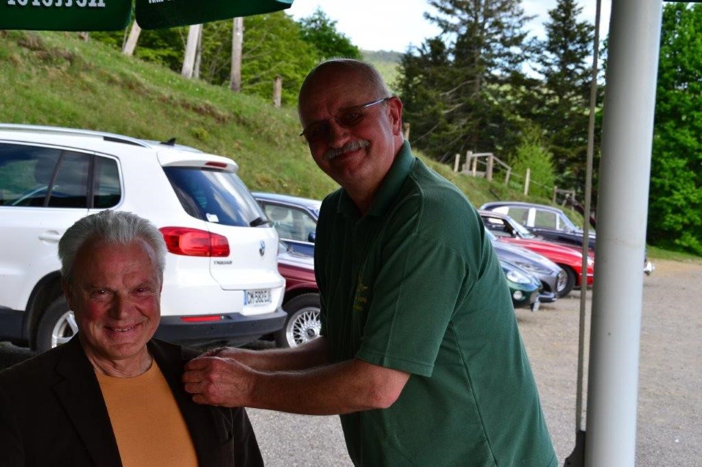 Eine Besonderheit der Gastronomie im Elsass sind die „Ferme-Auberge“ genannten Lokale, die eigentlich einmal sehr einfache Stätten zum Essen und Übernachten auf dem Bauernhof bzw. der Almhütte waren. Inzwischen sind daraus in den meisten Fällen ausgewachsene Restaurantbetriebe mit Pensionszimmern geworden, die eben etwas abgelegen ein paar Kilometer abseits der Route des Cretes oder anderer Hauptstraßen liegen. Wir fuhren über eine schmale und erneut ziemlich steile Straße zur Ferme-Auberge „Schafert“. Hier warteten Kaffee, Kuchen und weitere Leckereien. Der Verfasser gönnte sich einen echten „Siaskas mit Kirsch“. Das ist ein gezuckerter Frischkäse, der zum Zwecke besserer Verdaulichkeit mit Kirschwasser serviert wird. Muss man probiert haben! Der Wirt des „Schafert“ ist ein originaler und origineller Elsässer, der diese herrlichere Form der alemannischen Sprache mit der größten Selbstverständlichkeit anwendet. Das ist für nicht-alemannisch kalibrierte Ohren nicht ganz einfach, aber machbar! Der Dank der Teilnehmer galt unserem Sektionsleiter Alexander Seidel für die Organisation. Im Vorgriff auf den demnächst folgenden Postversand an alle anderen Jubilare wurde ihm vom Präsidenten an diesem schönen Ort die bronzene Ehrennadel der JAG für 15 Jahre Clubzugehörigkeit an das Revers geheftet.