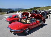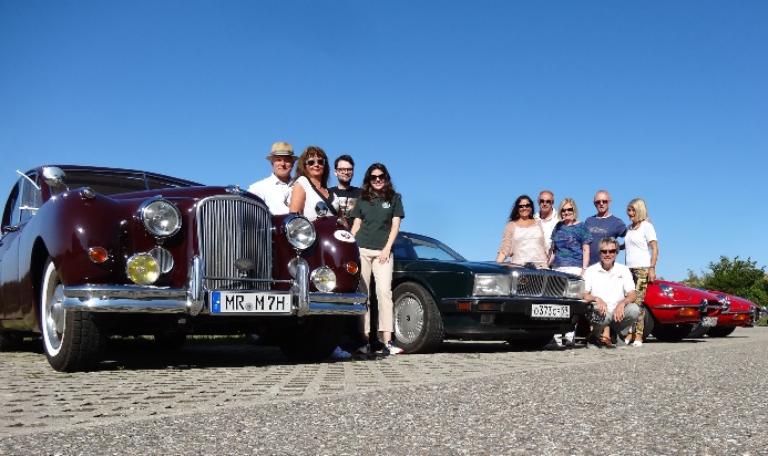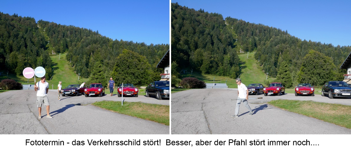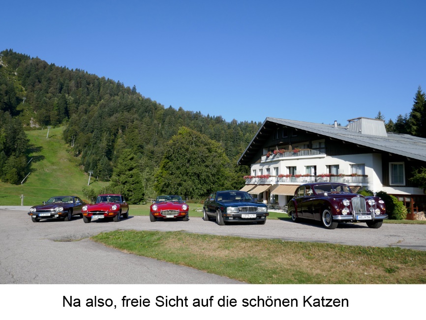 Nach einem leckeren Frühstück strahlte die Sonne vom Himmel und die Fahrer scharrten schon mit den Füßen. Aber erstmal natürlich Aufstellung der Katzen zum Gruppenfoto. Das sah vor dem Hotel im ersten Moment gut aus – aber halt: da ist ein Verkehrsschild, das stört! Matthias und René schritten sofort zur Tat: Schild + Pfahl vor dem E-Type Roadster aushebeln – fertig. Ein störungsfreies Foto entstand, dann wurde das Schild wieder aufgestellt und los ging es.