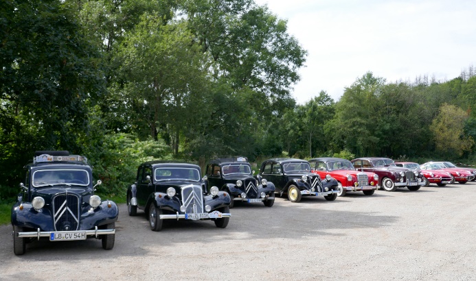 Bei unserer Weiterfahrt treffen wir an einer Straßenkreuzung auf einen Parkplatz, auf dem fein säuberlich aufgereiht Citroën-Oldtimer stehen. Da müssen wir uns natürlich dazustellen und die Autos bewundern, offensichtlich eine Ausfahrt deutscher Citroën-Liebhaber aus dem Raum Tübingen.