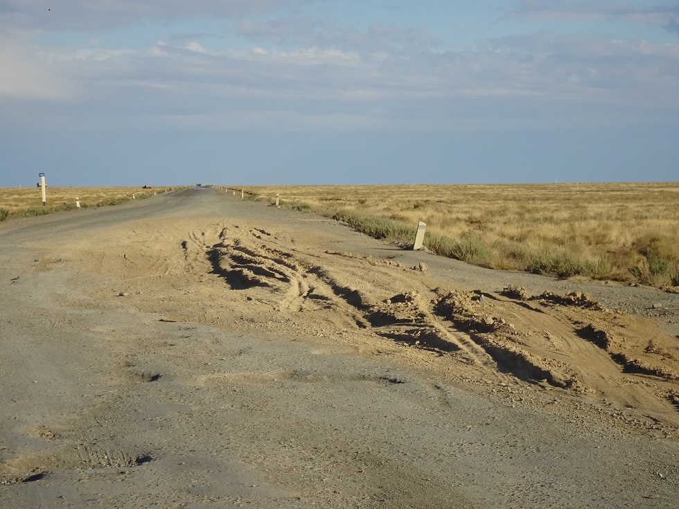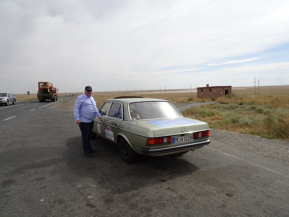 Die letzten 260 km nach Atyrau sind alle wieder separat gefahren. Die Straße dahin war der absolute Horror. Wir haben dafür 6 h gebraucht. Schlagloch an Schlagloch. Teilweise bis zu 40 cm tief und 1 m breit. Unsere Autos haben alle gelitten, aber bis auf gelockerte Auspuffanlagen bei 2 Teams ist nichts passiert. Nur die Polizei war wieder aktiv. Team 6 hat es am Ärgsten getroffen, Strafe 140 USD, Team 2 hat die Polizei in Gespräche verwickelt und mit 2 T-Shirts bezahlt.