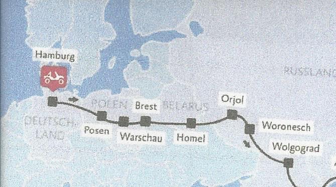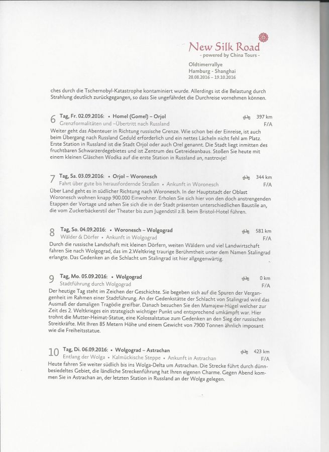 nun sind wir mittlerweile 8 Tage von Hamburg entfernt und 3.300 km – das sind ca ¼ der Gesamtstrecke. Wie in der letzten mail bereits vermeldet, stand uns am Freitag die Fahrt von Homel ( Weißrussland ) nach Orjol ( Russland ), wieder verbunden mit den unvorstellbar unsinnigen Grenzformalitäten. Susanne hat das ausführlich + präzise beschrieben, es ist schlichtweg unfassbar. Dabei hatte unsere Reiseleiterin einen kleinen Grenzübergang gewählt, ähnlich wie die grüne Grenze bei Straelen-Herongen, dafür mussten wir allerdings 160 km Umweg in Kauf nehmen. Als wir an der Grenze ankamen = Ausreise Weißrussland, waren nur unsere 8 Autos abzufertigen. Prima, dachten wir, hat sich der Umweg über die Landstraße durch die kleinen Ortschaften gelohnt. Es ging auch ziemlich flott, nach 1 ½ Stunden ließen uns die Weißrussen passieren in die Niemandslandzone. Und nun wurde es richtig zäh, aber unserer Stimmung tat das keinen Abbruch. Susanne hatte gehört, dass ich eine Kaffeemaschine + 1 Dose Lavazza dabei habe und solange gequengelt, bis ich alles rausrückte und sie in ihrem Wagen die Maschine einweihte. Anschließend haben Dieter +ich uns in unserem Auto einen Kaffee angesetzt, und dabei beinahe das Auto abgefackelt, weil: wir hatten einen 3-fach Zigarrenzünder chinesischer Bauart, dessen Verbindungskabel vom Haupt- Zigarrenanzünder zu dem 3-fach Stecker aus einer dünnen Litze bestand und diese ist durchgeschmort, Gottseidank haben wir das zufällig rechtzeitig bemerkt, wäre peinlich gewesen, wenn die Hülse des Zigarrenanzünders im Aschenbecker Schaden genommen hätte, denn dann wäre mit Garmin Navi Essig gewesen. Als wir nach Weißrussland kamen, haben wir realisiert, dass wir bis Shanghai kein Straßenschild mehr werden lesen können, und fragen kannst Du auch niemanden, die Leute sind alle sehr freundlich, aber verstehen tun sie nix, wir ja auch nicht. Also wie sagt man so schön unserem Rheinland: ett hett mal weder joot jejange. Die gesamte Abfertigung für die Einreise nach Russland hat dann nur noch etwas mehr als 4 Std gedauert, womit mehr als 6 Std meiner Restlebensdauer nutzlos verschwendet waren. In Orjol waren wir in einem 5*- Hotel untergebracht – alter sozialistischer Prägung, hier ist die Zeit vor 50 Jahren stehen geblieben, und das Personal – wie in alten Zeiten, man hatte das Gefühl, die schlafen bei Laufen ein, die aus der älteren Generation hatten das voll drauf – die schliefen beim Laufen, jedenfalls kam es mir so vor. Beim Einchecken wurde uns bedeutet, dass wir unsere Pässe am nächsten Morgen wieder bekommen, ich wollte wissen, warum und die Antwort lautete: weil es so lange dauert, bis wir alle Pässe vollständig kopiert haben, auf Nachfrage wurde mir klar, dass sie alle Seiten im Pass kopieren wollten, da habe ich dann entschieden laut und deutlich Protest eingelegt und gefragt, warum Putin wissen will, wo ich schon überall war und wo ich noch hin muss. Ich habe dann mehrfach nach der Empfangschefin gefragt und dann erhielt ich meinen Pass zurück + konnte auf’s Zimmer. Alla hat mir dann bestätigt, dass es wohl vor 40 Jahren, während des kalten Krieges, solch eine Vorschrift gab, aber das sich die Zeiten mittlerweile geändert haben, ist an diesem 5*- Hotel samt Personal vorbeigegangen. Und wie in alten Zeiten haben sich in dem Hotel viele gestylte Ladies mit Böcklunder- Lippen und Steilkurven aufgehalten, mir fiel direkt der Sketch von Dieter Krebs ( als Streifenpolizist ) und Iris Berben ( als Uroma ) ein: Sie zu ihm: Herr Wachtmeister, was ist mit den Damen, die laufen hier jeden Abend auf und ab, stundenlang Er zu ihr: Mütterchen, das sind nur Prostituierte Sie zu ihm: nanana, wenn da mal keine Nuten bei sind. Gestern von Orjol nach Woronesch, angenehme Fahrt, alles ganz entspannt, Susanne Hat auf in ihrem blog alles ausführlich beschrieben, dem kann ich nichts hinzufügen. Außer dass wir seit der Abfahrt jeden Tag bestes Hochsommerwetter haben mit Temperaturen um 25°. Und heute nun von Woronesch hierher nach Stalingrad, so weit ist mein Vater nicht gekommen – Gottseidank. 560 km ohne Autobahn, auf schnurgeraden Straßen, die ausgebaut sind wie unsere Bundesstraßen, Tempolimits: 110 km/h auf Autobahnen 90 km/h auf Bundesstraßen 50 km/h in Ortschaften. Das gesamte Verkehrsleitsystem ist perfekt, Hinweise + Beschilderung vorbildlich. Auch am Sonntag sind massenhaft LKW’s unterwegs.