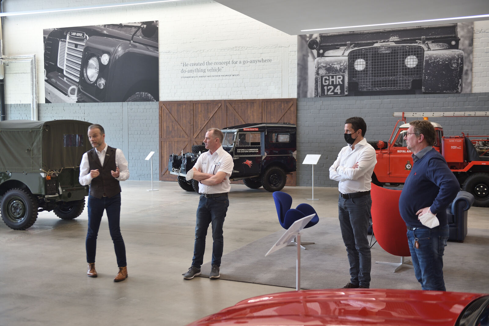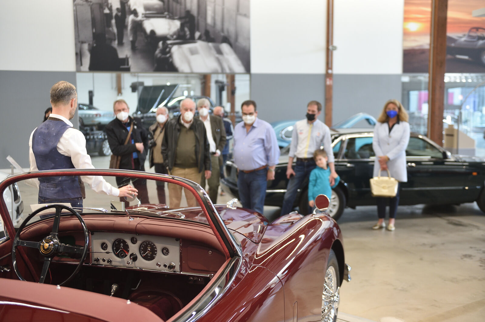 Derart kulinarisch und moralisch gestärkt, fuhren wir die kurze Strecke zum Classic Center, wo wir vom Geschäftsführer der JLR Classic Deutschland GmbH, Dr. Ralf Klasen, sehr freundlich begrüßt wurden. Außer ihm waren noch Oliver Schepp-Danne, Head of Sales, und Marco Walter, Workshop Manager, vor Ort, um uns zu informieren. In einer kleinen Einführung machte Ralf Klasen deutlich, dass Essen neben dem britischen JLR Classic Center das einzige Center weltweit ist. Das Center ist an die englische Zentrale angebunden und unabhängig von der Jaguar Land Rover Deutschland GmbH. Die Pflege der automobilen Jaguar-Tradition erfolgt u.a. durch den Neuaufbau von Fahrzeugen nach alten Plänen, wie aktuell den D-Type. Seit 2014 hat Jaguar bereits sechs Lightweight E-Type und neun XKSS wieder auf die Räder gestellt. Im Programm Classic Works bietet JLR Classic hochwertige Fahrzeuge mit Garantie sowie Werkstattarbeiten und Ersatzteilservice an. Ralf Klasen: „Natürlich sind wir eine Company, die Gewinn erzielen muss. Aber alle Mitarbeitenden sind stolz darauf, am Erhalt der Jaguar-Tradition mitwirken zu können.“