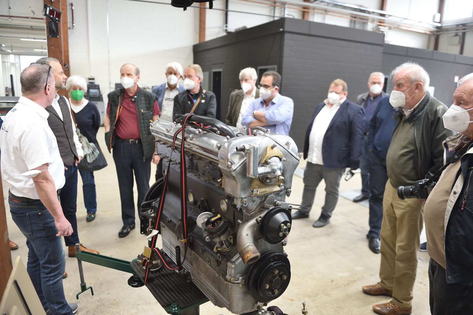 Danach führte Marco Walter durch die Werkstatt und erläuterte anhand von aktuellen Kundenfahrzeugen die durchzuführenden Arbeiten. Auch hier reichte die Palette vom klassischen MK IX bis hin zum „modernen“ XK8, vom einfachen Service bis zur kompletten Restaurierung. Wundervolle Fahrzeuge wie ein perfekt optimierter MK II, der ausgebaute Sechszylinder-Motor eines E-Type oder auch ein originaler Mark VII boten reichlich Gesprächsstoff. Umfassend konnte Marco Walter den Wissensdurst der interessierten Gruppe stillen. Auch die Ersatzteilversorgung sei bei Jaguar grundsätzlich gut. Verständlicherweise musste auch er bei Spezialteilen für den Vorkriegsklassiker SS 100 passen, der einem Mitglied zugelaufen ist.